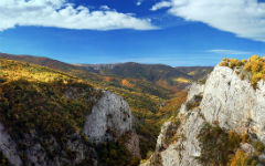 С вершины Орлиного залета открывается вид на значительную часть горного Крыма и степные пространства; к западу на горизонте узкой лентой синеет море.