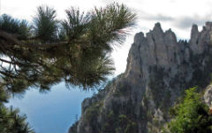 На обратном пути с вершины надо от тисса взять вправо к понижению кромки обрывов нагорья. Здесь начинается тропа в Мисхор и в Алупку. Тропа спускается мимо сосны, которую за форму ее кроны прозвали «самолетом», — крона вытянута по направлению господствующих ветров. Кое-где тропа разбивается на десяток небольших тропок, все они бегут вниз, т. е. в нужном нам направлении. Ориентиром служит Сосновый утес, маячащий далеко внизу, сквозь колоннаду сероватых стволов крымской сосны. От утеса тропа забирает влево и обходит верховье большой лесистой балки, давая затем ответвления влево — на Гаспру, Кореиз и Мисхор. У следующего разветвления — маленький родник. От родничка идти правым ответвлением тропы, приводящим в великолепный мачтовый лес крымской сосны. Воздух здесь насыщен ароматами смолы и хвои.